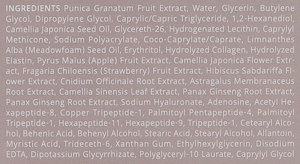 | Склад | Camellia japonica flower extract, fragaria chiloensis (strawberry) fruit extract, hibiscus sabdariffa flower extract, cnidium officinale root extract, astragalus membranaceus root extract, camellia sinensis leaf extract, panax ginseng root extract, panax ginseng root extract, sodium hyaluronate, adenosine, acetyl hexapeptide-8, copper tripeptide-1, palmitoyl pentapeptide-4, palmitoyl tripeptide-1, hexapeptide-11, hexapeptide-9, tripeptide-1, cetearyl alcohol, behenic acid, behenyl alcohol, Punica granatum fruit extract, water, glycerin, butylene glycol, dipropylene glycol, caprylic/capric triglyceride, 1,2-hexanediol, camellia japonica seed oil, glycereth-26, hydrogenated lecithin, caprylyl methicone, sodium polyacrylate, coco-caprylate/caprate, limnanthes alba (meadowfoam) seed oil, erythritol, hydrolyzed collagen, hydrolyzed elastin, pyrus malus (apple) fruit extract, camellia japonica flower extract, fragaria chiloensis (strawberry) fruit extract, Stearic acid, stearyl alcohol, allantoin, myristic acid, trideceth-6, xanthan gum, ethylhexylglycerin, disodium edta, dipotassium glycyrrhizate, polyglyceryl-10 laurate, caprylyl glycol |