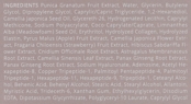 - Екстракт граната (33,3%) – стимулює вироблення колагену, прискорює регенерацію клітин, покращує мікроциркуляцію крові, має потужну антиоксидантну дію, захищає шкіру від впливу зовнішнього середовища та відновлює гідроліпідний бар'єр.