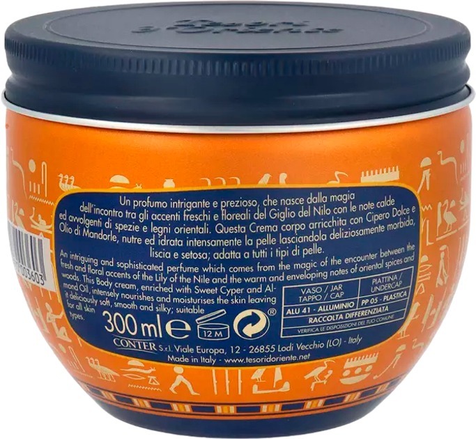 Еліксир краси з живильною та відновлювальною дією - парфумований крем для тіла бренду Tesori d'Oriente! Продукт містить екстракт папірусу та олію мигдалю, зволожує шкіру і залишає на ній розкішні пахощі. Аромат належить до групи східних пряних. Композиція вступає свіжістю фруктових і зелених нот з додаванням цитрусових акцентів бергамота і нюансів іланг-ілангу. У серці квіткові пахощі посилено синім лотосом, елегантним ірисом, ніжним жасмином і розкішною трояндою. Далі відчутний пряний присмак спецій і деревні півтони папірусу. Пудрові та східні ноти на тлі м'якості мускусу і деревних акцентів формують благородний шлейф. Інтригуючий аромат - парфумований крем Tesori d'Oriente!