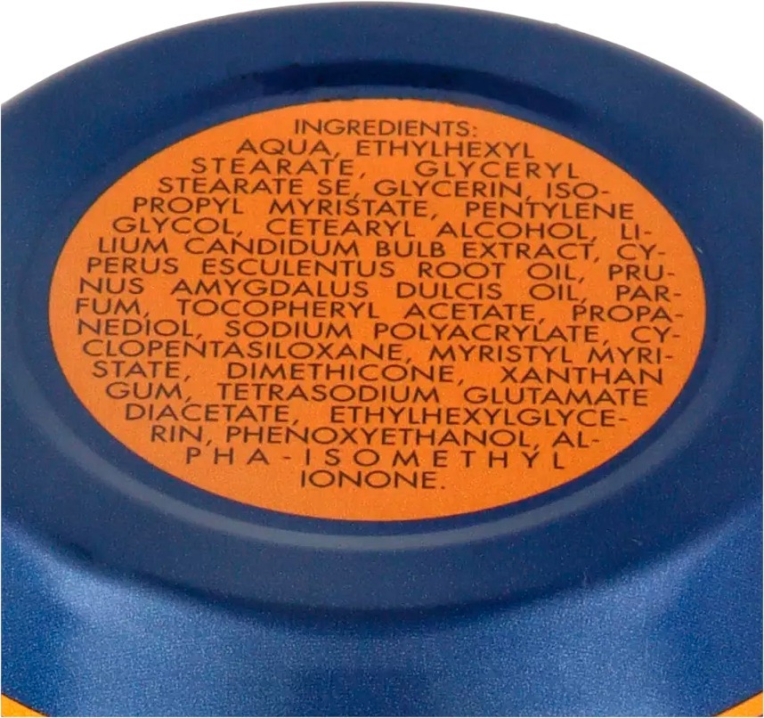 | Склад | Aqua, Glyceryl Stearate Se, Ethylhexyl Stearate, Glycerin, Isopropyl Myristate, Cetearyl Alcohol, Parfum, Commiphora Mypha Resin Extract. Passiflora Incarnata Seed Oil, Tocopheryl Acetate, Myristyl Myristate, Dimethicone, Cyclopentasiloxane, Sodium Polyacrylate, Xanthan Gum, Bht, Alcohol Denat., Pentylene Glycol, Phenoxyethanol, Imidazolidinyl Urea, Methylparaben, Ethylparaben, Benzyl Benzoate, Citronellol, Hexyl Cinnamal, Linalool, Limonene |