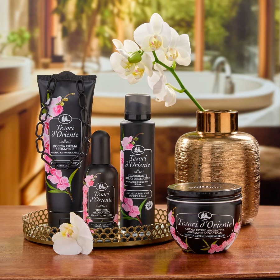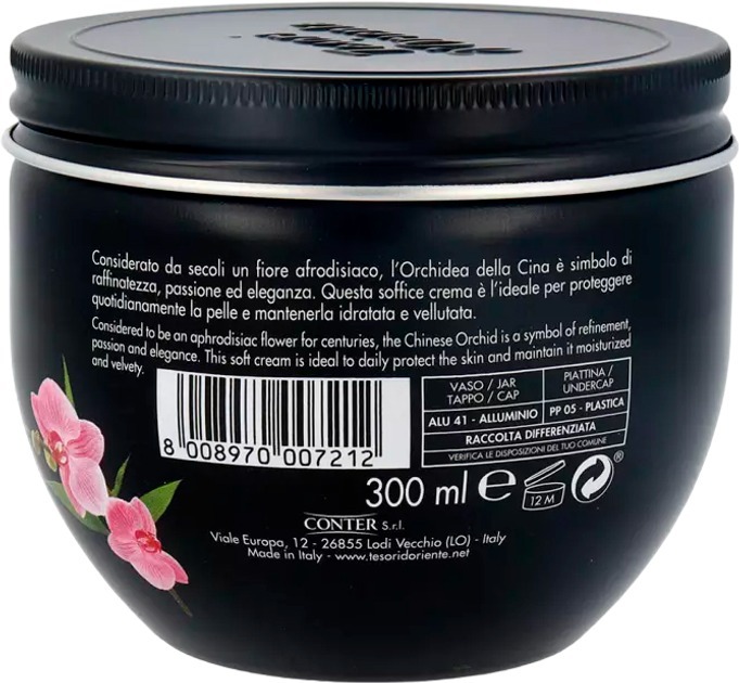 Символ витонченості, елегантності та краси — китайська орхідея! Парфумований крем для тіла ідеально підходить для догляду після купання, містить заспокійливі та живильні компоненти. Завдяки легкій консистенції продукт миттєво зволожує та освітлює шкіру, надає оксамитової м’якості, чудово ароматизує. Аромат належить до групи східних квіткових. На початку представлені цитрусові акорди соковитого мандарина і стиглого апельсина в оточенні зелених відтінків листя смородини. У серці — запашний букет із дивовижної орхідеї, ніжної квітки тіаре, витонченого апельсинового цвіту, елегантного жасмину. Завершується композиція контрастним звучанням м’якості мускусу, деревними півтонами сандалу, солодкими вкрапленнями ванілі та праліне, сяйнистою миррою. Інтенсивний, магнетичний, чуттєвий — аромат Tesori d’Oriente!
