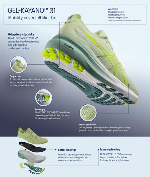 Gel-Kayano 31 - наслідуючи новий підхід до адаптивної стабільності та чудового комфорту, цей випуск може допомогти бігунам з будь-якими здібностями йти далі та рухати свої думки. Філософія дизайну Asics полягає в постійних невеликих поліпшеннях для створення продуктів, які найкраще підходять як для тіла, так і для розуму.