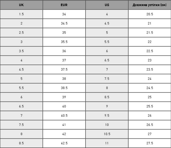 | Довжина ступні, см | 22.5 |