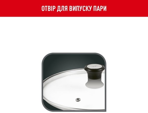 Кришка для посуду Tefal 28097612 має круглу форму, виготовлена із загартованого скла з металевим обідком, передбачено отвір для випуску пари. Кришка підійде як для каструль так і сковорідок, діаметром 26 см.