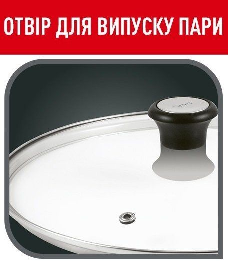 Готувати набагато простіше та зручніше зі скляною кришкою Tefal. Загартоване скло з отвором для випуску пари та обідком із нержавіючої сталі дозволяє стежити за процесом приготування.