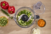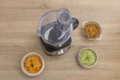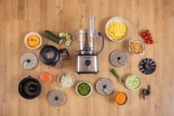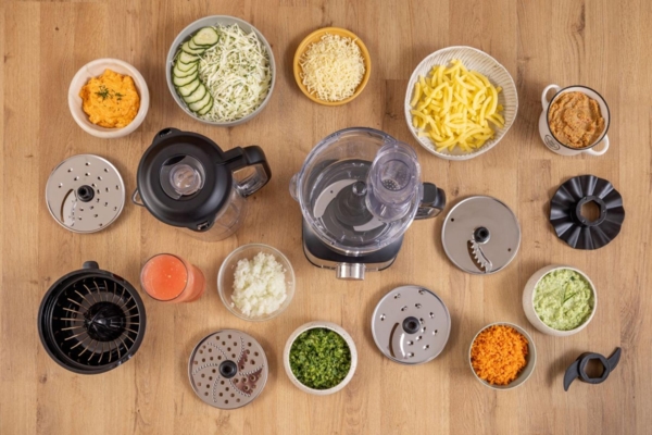 Цей компактний пристрій - справжній локомотив для кухні, оснащений широким асортиментом аксесуарів, які роблять його ідеальним універсальним приладом для всіх ваших кулінарних потреб. Він включає в себе 2-літрову насадку, пластиковий контейнер для змішування об'ємом 1,75 л, насадку для приготування смузі об'ємом 0,7 л, універсальний ніж, ніж для тіста, чотири диски для нарізки, насадку для цитрусових та диск для емульгування. У ньому є все необхідне для приготування страв на кухні.