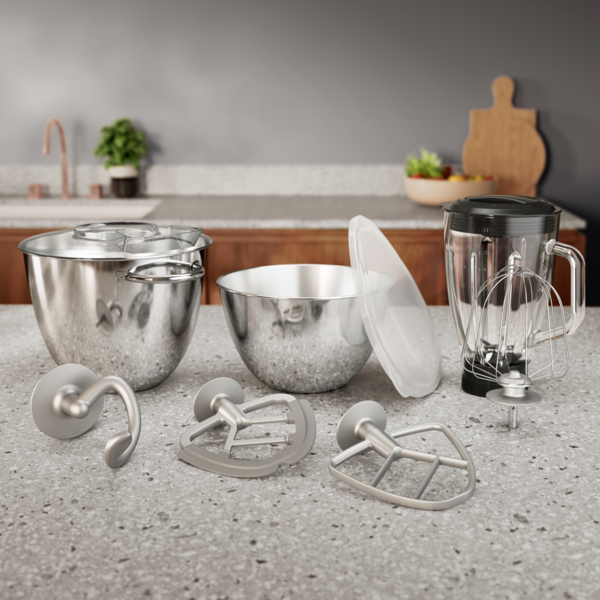 Різноманітні інструменти й аксесуари допоможуть вам експериментувати на кухні. Гак для замішування густого тіста, вінчик для приготування глазурі й безе, SoftEdgeBeater із вбудованою силіконовою лопаткою й багато чого іншого.