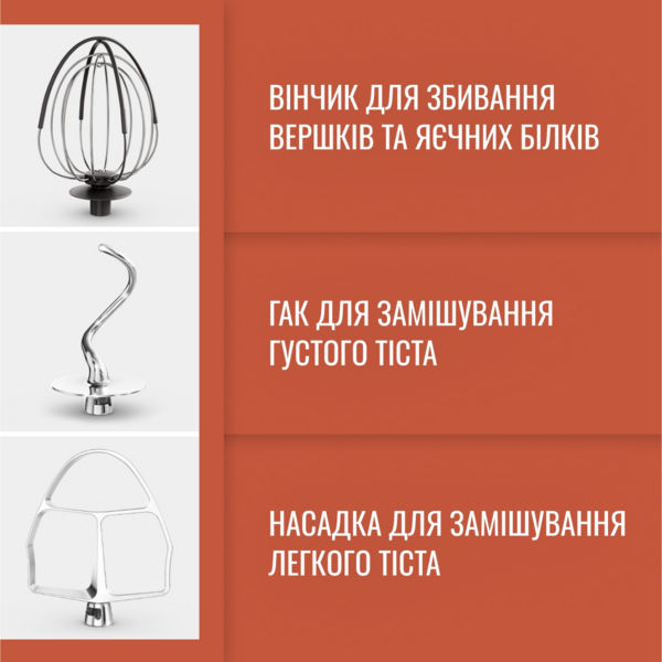 | Насадки | Блендер, Гнучкий збивач, Для терки, Для тіста, Гак для тіста, Міні-чопер, М'ясорубка, Насадка для шаткування |