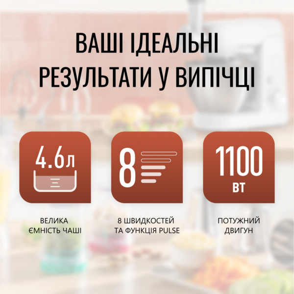 Двигун потужністю 1100 Вт дарує впевнену роботу навіть з найгустішим тістом. Бездоганний та швидкий результат збивання, змішування та замішування.