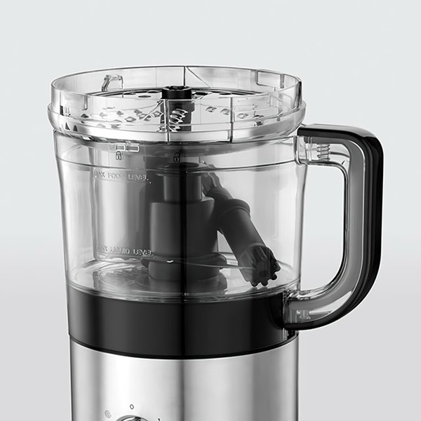 Приналежності, придатні для миття в посудомийній машині, включають ємність для змішування об'ємом 1,2 літра об'ємом 1,9 літра, знімний ніж із неіржавкої сталі та диск, що обертається, для нарізання і терки.