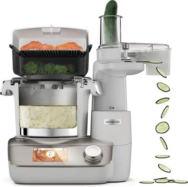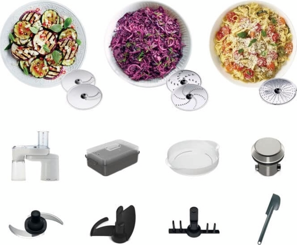 До комплекту входять ніж, насадка для перемішування, віночок, піддон для приготування на парі та адаптер для повільного варіння, кожен з яких спеціально розроблений для виконання поставленого завдання.