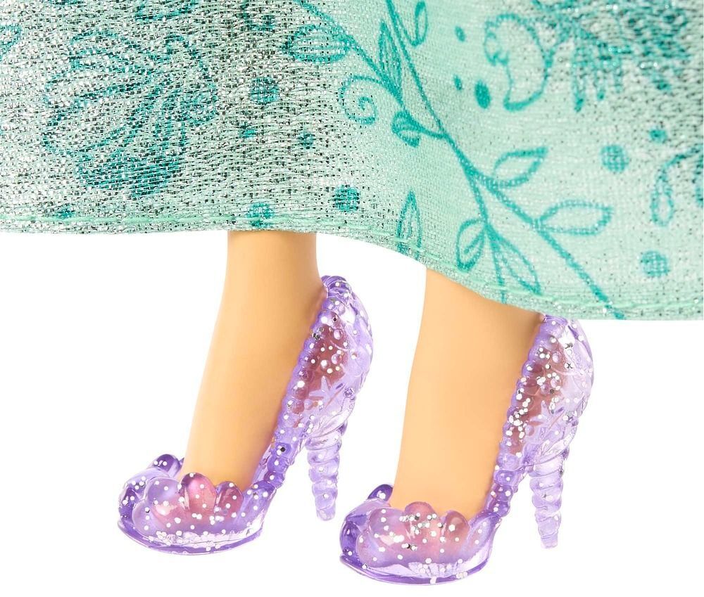 Ця лялечка одягнена в дивовижно красивий наряд: сукня шикарного смарагдового відтінку, низ якої зроблений з блискучої тканини, що грайливо мерехтить на сонечку. Ніжки Аріель взуті в напівпрозорі фіолетові туфельки, які можна знімати і одягати назад. Яскраво виглядає смарагдовий наряд в парі з пишним розпущеним волоссям вогняного відтінку, що прикрашене чарівною фіолетовою тіарою. У своєму образі Аріель готова відправлятись на бал! Лялька-принцеса Аріель стане чудовим подарунком для дітей від 3 років! Із нею вони зможуть розігрувати улюблені сцени з мультфільму або вигадувати власні пригоди!