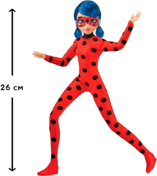 Неймовірна Леді Баг в новому форматі: висота ляльки 26 см, в неї гарна зачіска, червоно-чорний костюм, в наборі є йо-йо, Квамі Тіккі, сережки та взуття. Тепер гра виходить на новий рівень. У ляльки 13 точок артикуляції - руки та ноги гнуться у всіх суглобах, голова повертається.