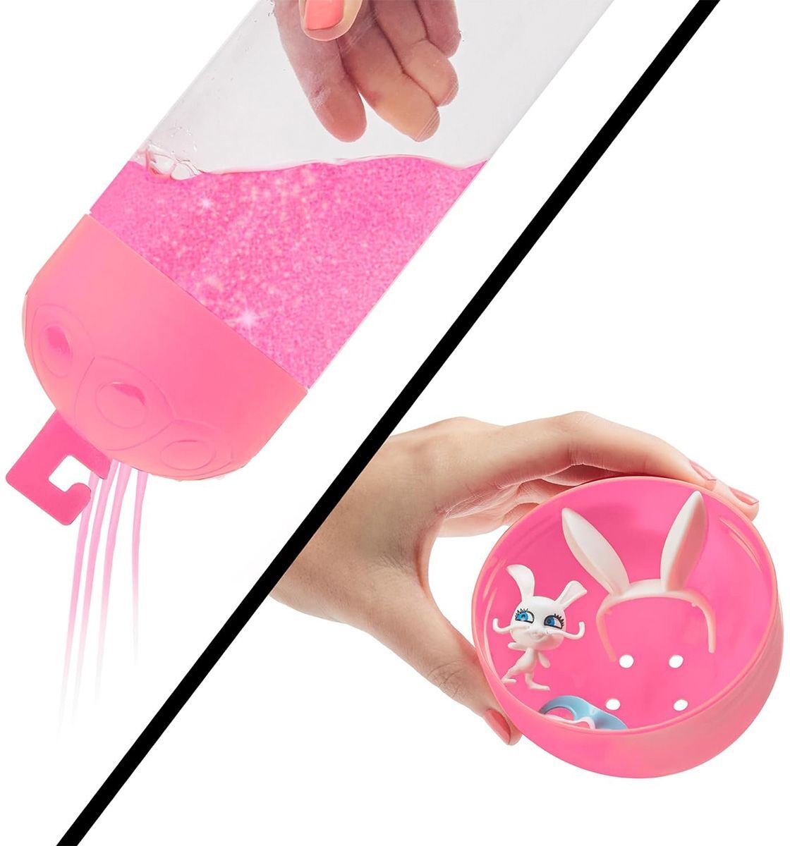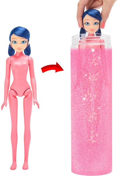 - Неймовірний сюрприз - дістань лялечку з контейнера і наповни його водою. Вау! На лялечці спеціальне секретне покриття. Давай швидше дізнаємося, який сьогодні костюм буде у Марінетт. Помісти ляльку всередину контейнера, покрути її - і ось уже Марінетт перетворюється просто на твоїх очах.