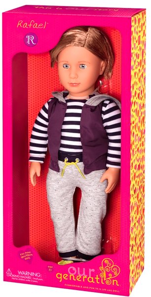 Рафаель – це унікальна лялька з неймовірною серії Our Generation, адже він – хлопчик. Цей милий, стильний і спортивний хлопець стане прекрасним доповненням до колекції ляльок Our Generation. Він вихований і, як слід справжньому джентльменові, має хороші манери. Рафаель активний і веселий, любить прогулянки і добре проводити час з друзями. Лялька виготовлена з вінілу і має м'яке наповнення.
