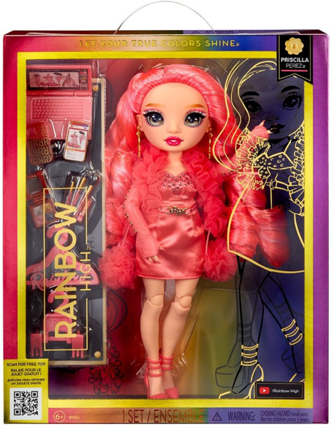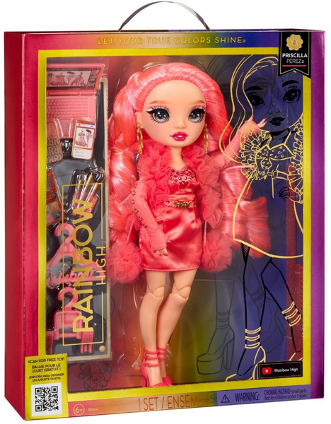 Ляльки Rainbow High завоювали визнання і любов дітей по всьому світу! Яскраві, різнокольорові та стильні - вони стали справжнім феноменом у світі модних ляльок. Збери їх усіх, щоб створити свою модну і стильну фешн-колекцію! Прісцилла Перез - гламурна дівчина з надзвичайно красивими очима! Ця лялька з довгим волоссям має унікальний стиль і віддає перевагу тільки модному одягу. А з такими аксесуарами її вбрання будуть виглядати ще яскравіше і привабливіше! А ще ці ляльки дають можливість не тільки створити модний образ, а й зробити суперзачіску, яка точно вразить оточуючих своєю оригінальністю! Рекомендовано для дітей віком від 6 років.