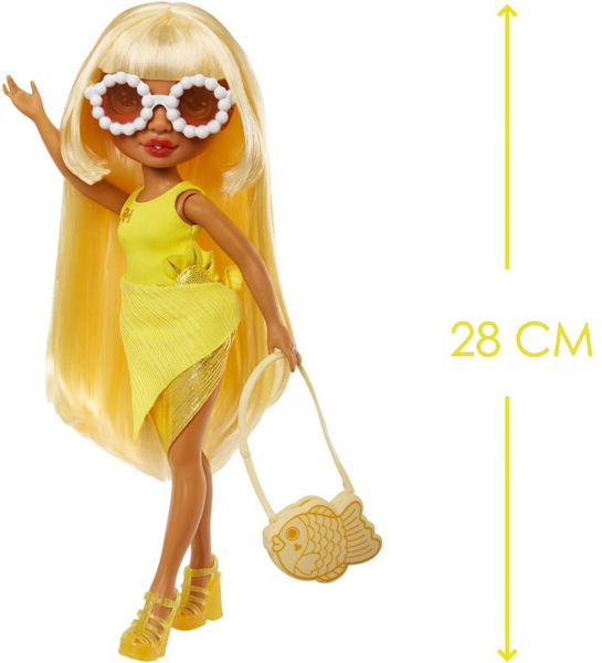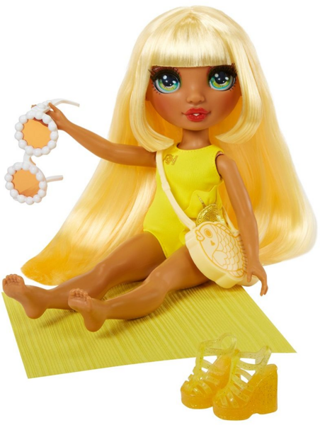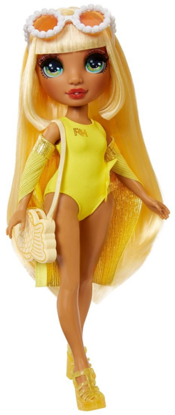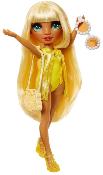 Подружки Rainbow High їдуть на пляж і готові весело проводити час на золотому піску та купатися в блакитному морі. І в будь-якій ситуації мати мегастильний вигляд! Зустрічайте нову серію Rainbow High серії 'Swim & Style', що складається з 4 лялечок у яскравих купальниках із літніми аксесуарами та навіть із парео! Збери їх усіх, щоб створити свою модну та стильну веселку! Лялька Rainbow High серії 'Swim & Style' - Санні - стильна красуня з волоссям і одягом ніжного жовтого кольору. Рекомендовано для дітей віком від 4 років.