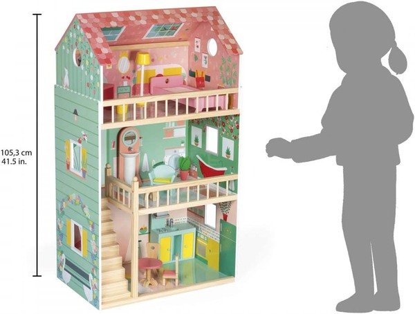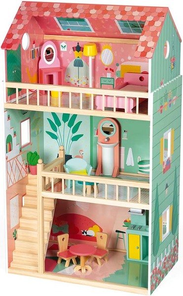 Цей чудовий 3-поверховий дерев'яний ляльковий будиночок порадує всіх дітей, які шукають справжній будинок для своїх улюблених ляльок. Діти віком від 3 років зможуть створювати свій власний світ і вигадувати власні історії годинами поспіль! Цей гарно оформлений будиночок з відповідними меблями дуже практичний. Дах вирізаний, щоб забезпечити кращий доступ на верхній поверх. Будиночок підходить для фігурок висотою до 30 см. Він обладнаний сходами та 2 дерев'яними бар'єрами. 12 предметів меблів також включені: ліжко, раковина, туалетний столик, кухня, стіл, 2 стільці, крісло, лампа, журнальний столик, табурет і зелена рослина.
