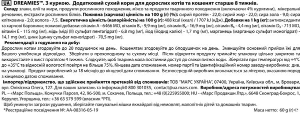DREAMIES 3 куркою. Додатковий сухий корм для дорослих котів та кошенят старше 8 тижнів.