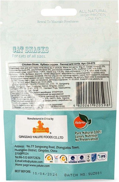 Снеки Yalute – новий стандарт ласощів для котів. Апетитні кубики виготовляють з відбірного м'яса курки та інших природних складників. Тому ці закуски мають чудовий смак і підтримують відмінну фізичну форму улюбленців.