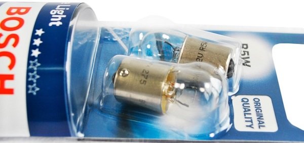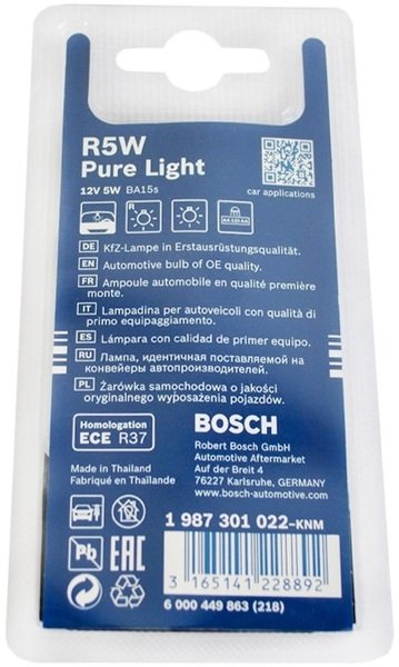 Це лампа розжарювання, серії Pure Light, від компанії Bosch, застосовується у внутрішньому освітленні для приладової панелі, бардачка і салону, і в зовнішньому освітленні для габаритних вогнів передньої оптики, і для стоп-сигналів, підсвічування номерного знака в задній оптиці. Створена для заміни заводського світла і забезпечує повне висвітлення як всередині, так і навколо автомобіля, що при яскравому випромінюванні вони допомагають своєчасно повідомити про свої наміри іншим учасникам дорожнього руху, в уникненні аварійних ситуацій. Конструкція лампочок стійка до вібрацій і витримує екстремальні навантаження. Розмір стандартний, діаметр 19 мм і довжина 30 мм, відповідає стандартам посадочних місць. Установка таких лампочок дуже проста, Ви це можете зробити самостійно, в домашніх умовах, головне не доторкатися до колби лампочки, що б не залишати відбитки пальців, а так само бажане її попередньо протерти спиртом. Тип лампочки R5W/BA15s - це циліндричний байонетний цоколь, з одним контактом, який легко вставляється і повертається на 90 градусів. Колба непофарбована, прозора, виготовлена з якісного скла, воно міцне і скорочує вплив шкідливого ультрафіолету. Випромінюється світло біле, але комфортне для очей. Споживана потужність в 5 Вт, дає досить хороше світіння. Робоча напруга 12 В, застосовність тільки для легкових автомобілів і двоколісних транспортних засобів.