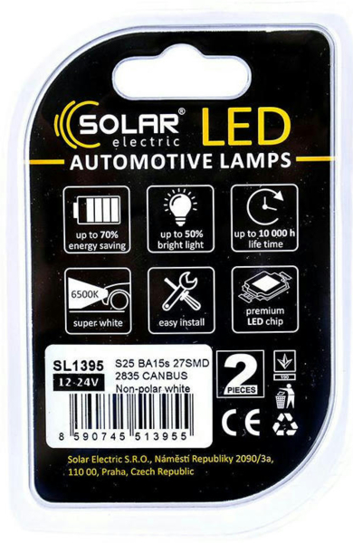 Лампи Solar white SL1395 (2 шт.) працюють від напруги 12–24 В і універсально підходять як для легкових, так і для вантажних транспортних засобів. Завдяки нейтрально-білому світлу з колірною температурою 6500К вони забезпечують чудову видимість навіть у яскравий, сонячний день і підвищують безпеку під час руху дорогами загального користування.