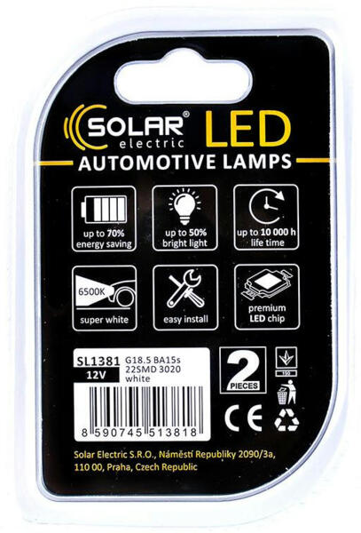 Лампи Solar white SL1381 (2 шт.) працюють від напруги 12 В і універсально підходять як для легкових, так і для вантажних транспортних засобів. Завдяки нейтрально-білому світлу з колірною температурою 6500К вони забезпечують чудову видимість навіть у яскравий, сонячний день і підвищують безпеку під час руху дорогами загального користування.