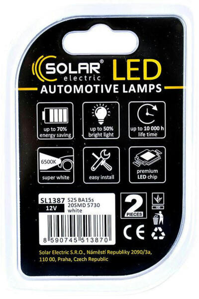 Лампи Solar white SL1387 (2 шт.) працюють від напруги 12 В і універсально підходять як для легкових, так і для вантажних транспортних засобів. Завдяки нейтрально-білому світлу з колірною температурою 6500К вони забезпечують чудову видимість навіть у яскравий, сонячний день і підвищують безпеку під час руху дорогами загального користування.