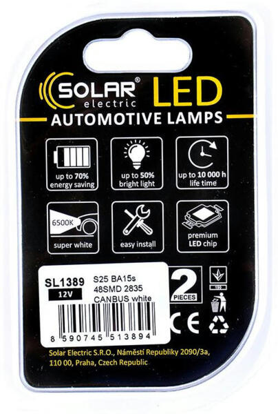 Лампи Solar white SL1389 (2 шт.) працюють від напруги 12 В і універсально підходять як для легкових, так і для вантажних транспортних засобів. Завдяки нейтрально-білому світлу з колірною температурою 6500К вони забезпечують чудову видимість навіть у яскравий, сонячний день і підвищують безпеку під час руху дорогами загального користування.