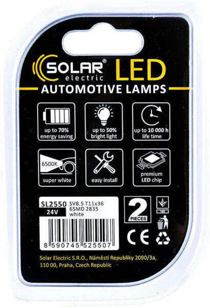 Лампочки Solar SL2550 працюють від бортової мережі з напругою 24 В і універсально підходять для вантажних автомобілів. Корпус виготовлений із високоякісних матеріалів, має чудову стійкість до вібрацій і ударів, вирізняється високою теплопровідністю та забезпечує ефективне охолодження світлодіодів.