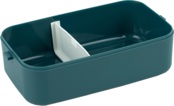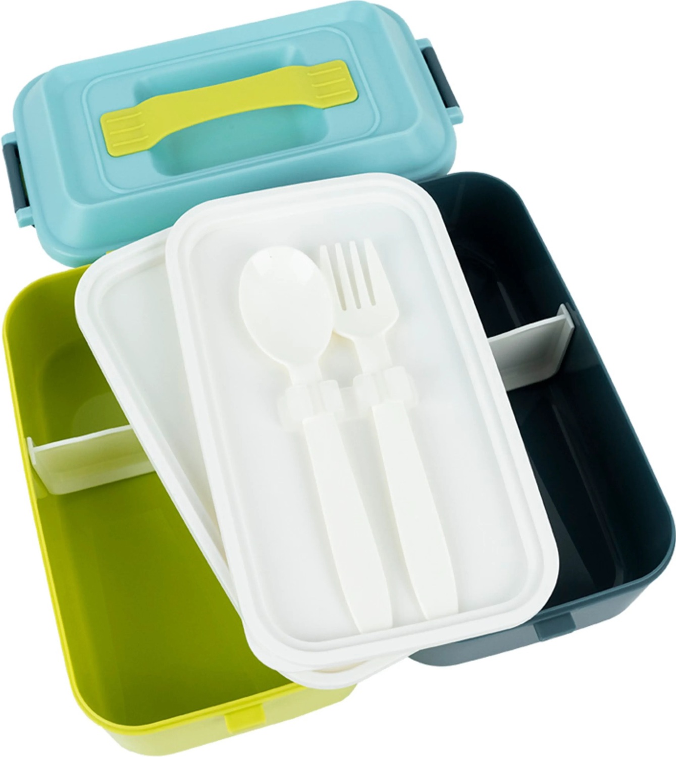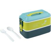 Міцна верхня кришка з ручкою забезпечує зручне перенесення та щільне закриття. Надійні бічні клямки фіксують обидві ємності разом. Всередині кожна ємність розділена на дві частини знімною перегородкою, яка перешкоджає змішуванню продуктів. У комплекті є пластикова ложка та виделка, зручно зафіксовані на додатковій внутрішній кришці.