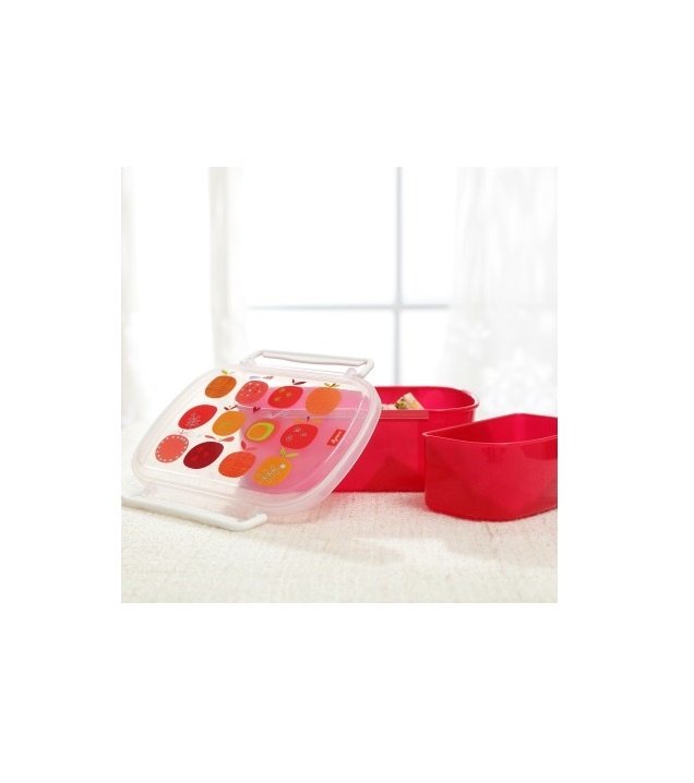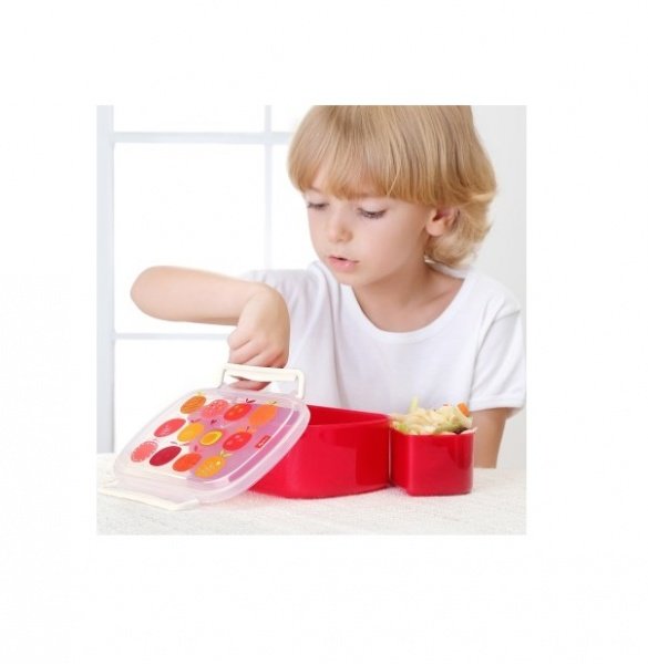 Усередині два відділи, для раціонального розподілу продуктів (овочі і фрукти, м'ясо та гарнір). Коробочка міцна і легка, розмір 17х7х11 см. Кришка герметична, легко відкривається і закривається без зайвих зусиль. Ланчбокс модного дизайну, ємність червоного кольору, кришка напівпрозора із зображенням яблучок. Яскрава коробочка підкреслить індивідуальний стиль вашої дитини.