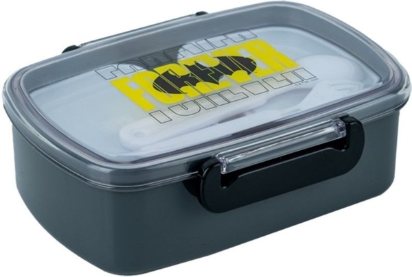 Дуже місткий, чудово розмістить у собі повноцінний обід (розмір 18х13,5х6 см). Кришка щільно закривається та фіксується за допомогою надійних бічних клямок. Завдяки тому, що кришка прозора, можна побачити, що всередині контейнера, не відкриваючи його. Внутрішнє наповнення включає столове приладдя для комфортного перекусу: виделку, ложку та два контейнери. Таким чином, можна складати різні страви в один ланчбокс. Це дуже зручно та гігієнічно.