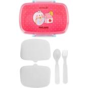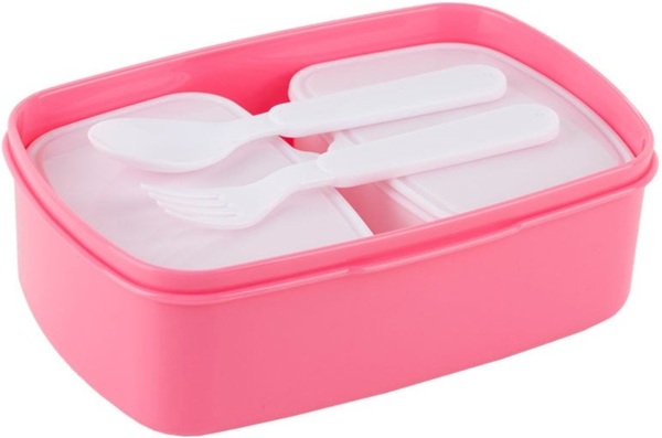 Внутрішнє наповнення включає столове приладдя для комфортного перекусу: виделка, ложка та два контейнери. Таким чином, можна складати різні страви в один ланчбокс.