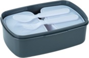 Дуже місткий, чудово розмістить у собі повноцінний обід (розмір 18х13,5х6 см). Кришка щільно закривається та фіксується за допомогою надійних бічних клямок. Завдяки тому, що кришка прозора, можна побачити, що всередині контейнера, не відкриваючи його. Внутрішнє наповнення включає столове приладдя для комфортного перекусу: виделку, ложку та два контейнери. Таким чином, можна складати різні страви в один ланчбокс. Це дуже зручно та гігієнічно.