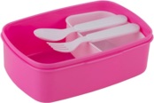 Внутрішнє наповнення включає столові прилади для комфортного перекусу: виделка, ложка та контейнер.