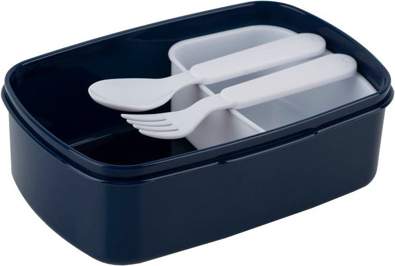 Внутрішнє наповнення включає столові прилади для комфортного перекусу: виделка, ложка та контейнер.