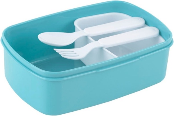 Внутрішнє наповнення включає столові прилади для комфортного перекусу: виделка, ложка та контейнер.
