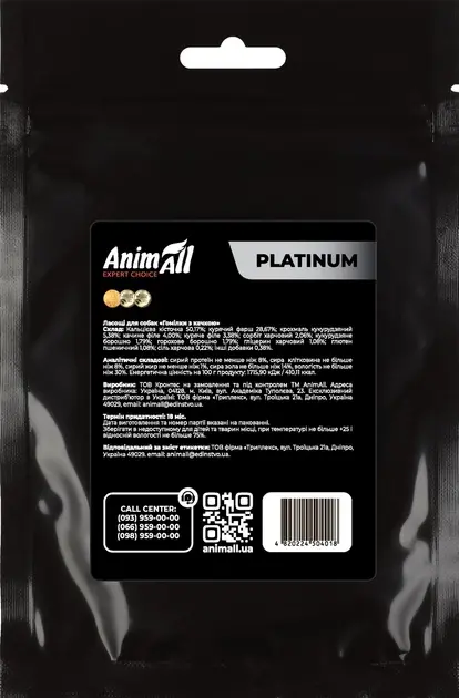 Зверніть увагу, що ласощі AnimAll Platinum не призначені як повноцінна заміна регулярного харчування вашого собаки, і повинні використовуватися тільки як додатковий корм.