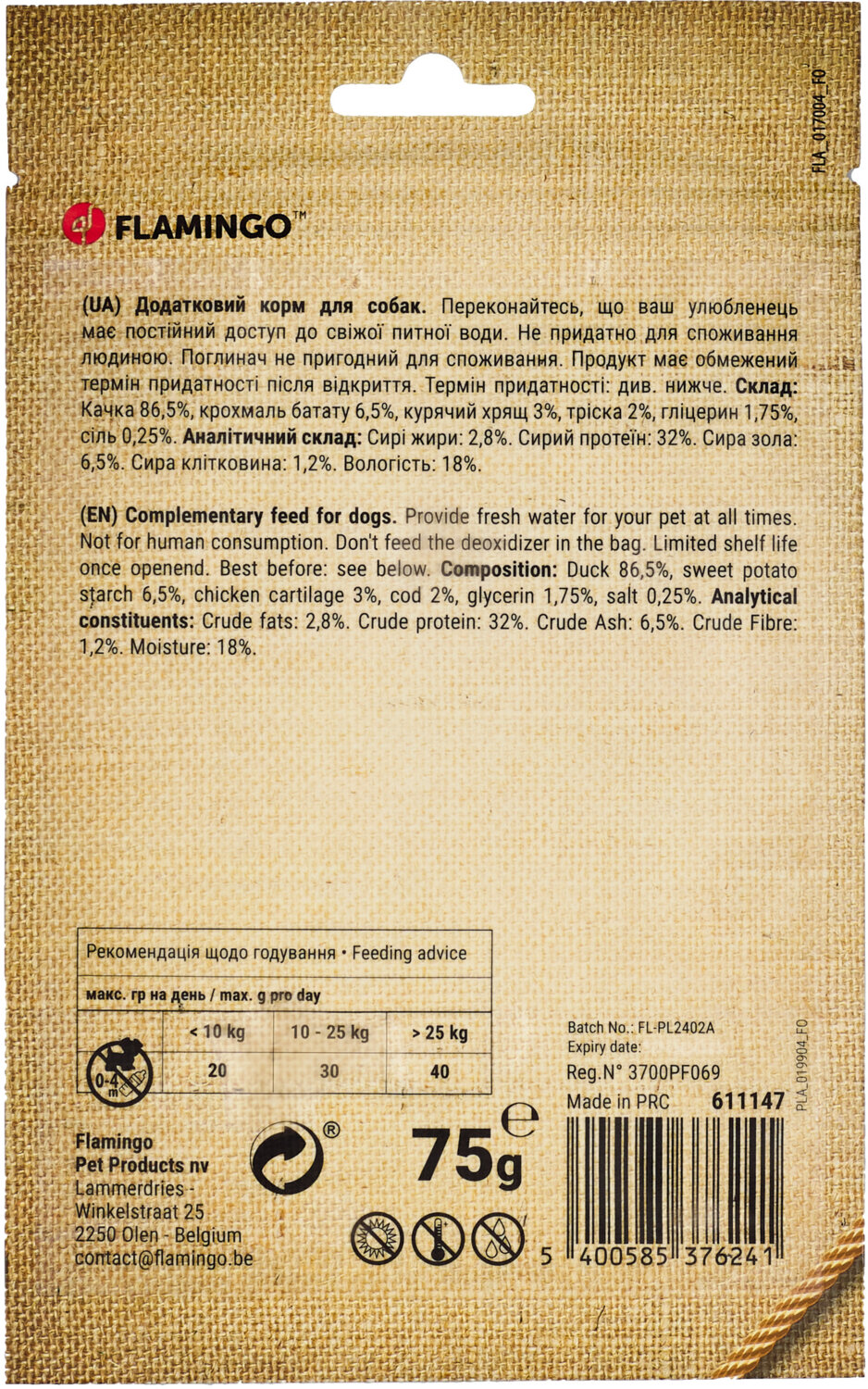 Ласощі для собак Flamingo з м’ясом качки 20 мм 17 см 3 шт 155 гЛасощі для собак Flamingo з м’ясом качки 20 мм 17 см 3 шт 155 г
