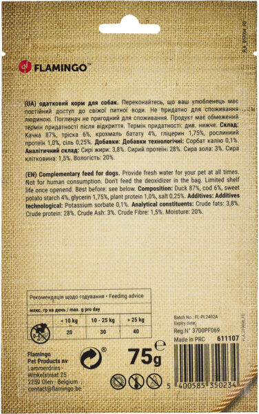 Ласощі для собак Flamingo качині стріпси 75 гЛасощі для собак Flamingo качині стріпси 75 г