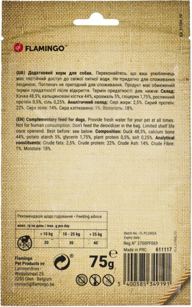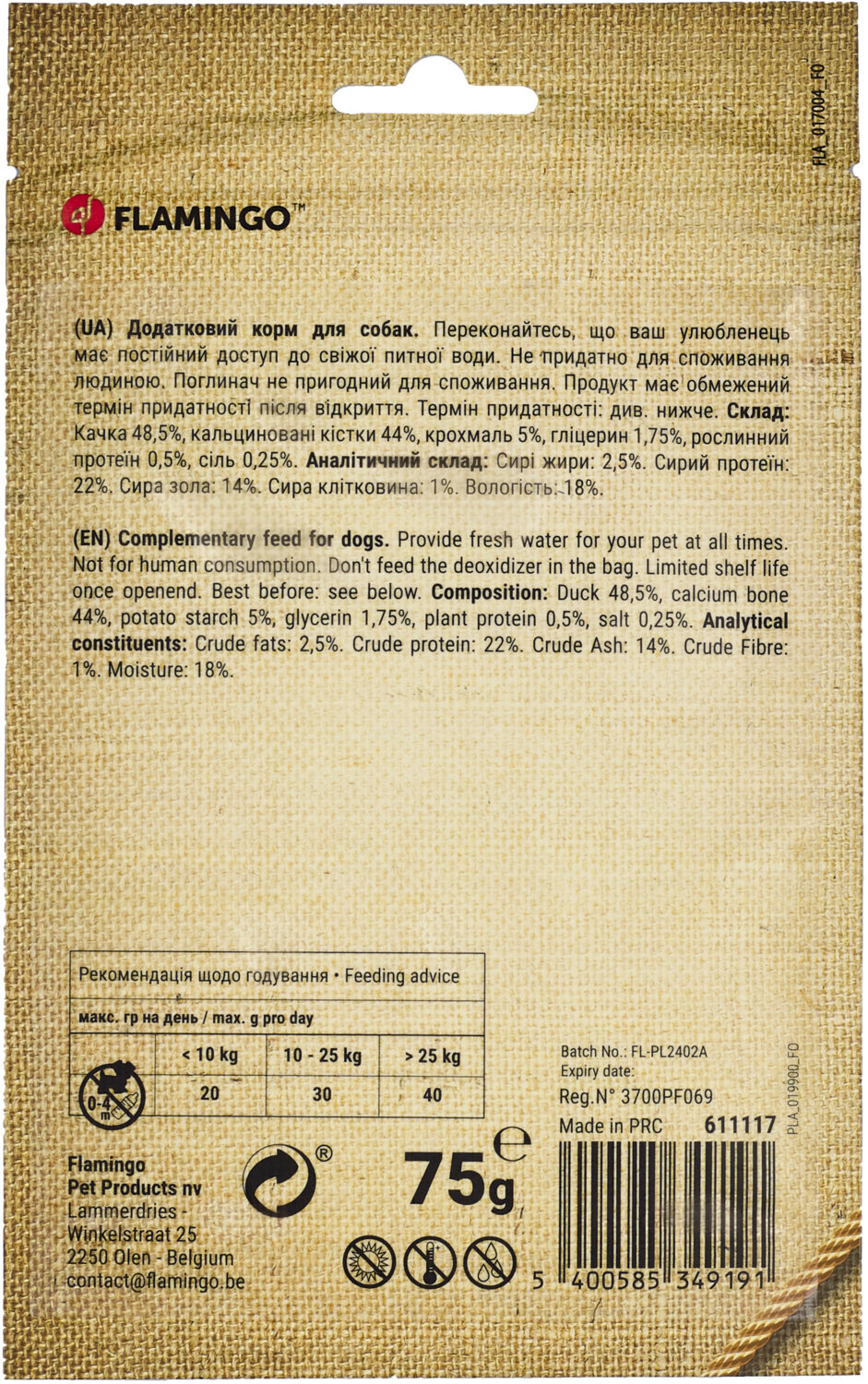 - Ласощі для собак Flamingo кальциновані кісточки з качкою 75 г