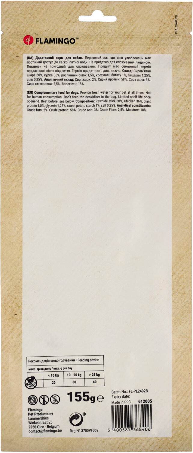 - Ласощі для собак Flamingo з м’ясом курки 20 мм 17 см 3 шт 155 г