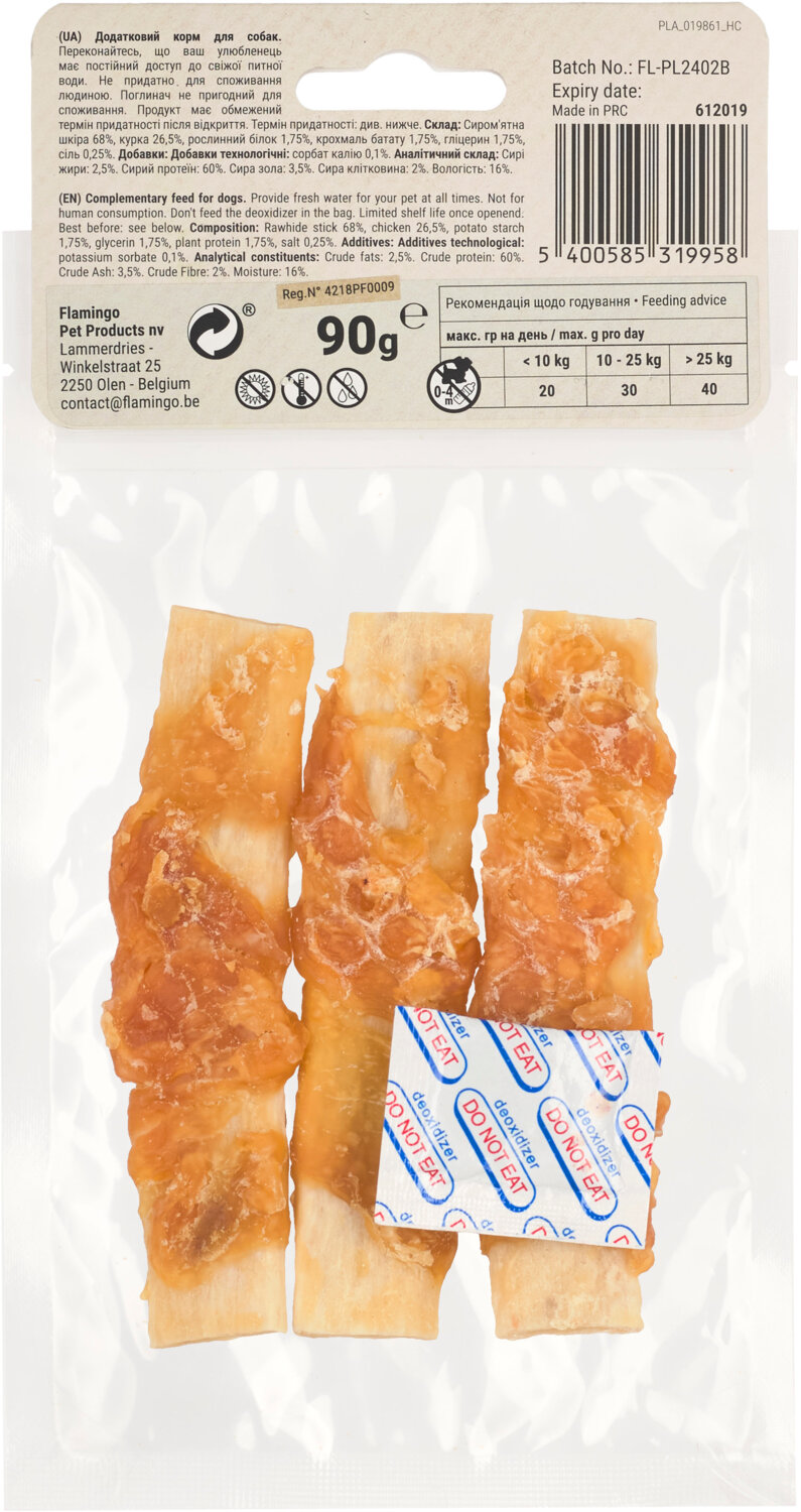 - Ласощі жувальні ребра для собак Flamingo з м’ясом курки 12 см 3 шт 90 г