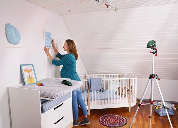 Работать стало в разы проще и удобнее с лазерным нивелиром Bosch UniversalLevel 3. Это просто замечательное решение для определения уровня. Благодаря конструкции абсолютно ровные линии можно определять на любой высоте и практически по всей высоте или ширине стены. И все это в считанные секунды. Есть проекция отвеса. Лазерные лучи очень яркие и четкие, точность с погрешностью +/-0,5 мм. Рабочий диапазон 10 м.