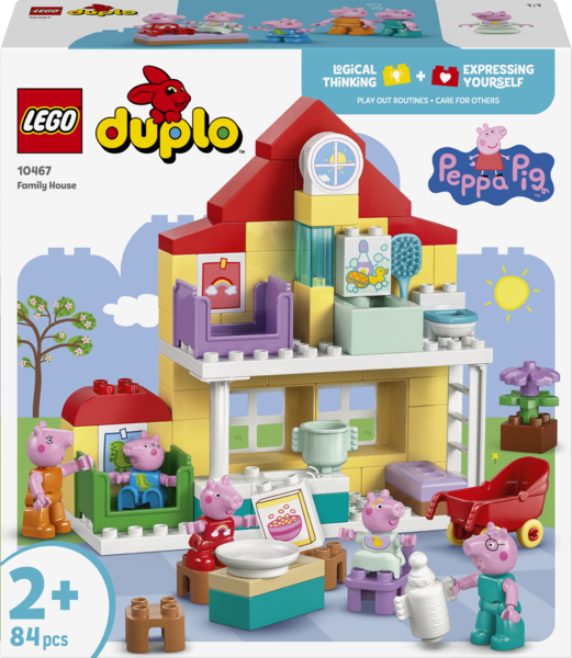 Малюки відтворюють повсякденні справи разом зі своїми улюбленими телевізійними героями за допомогою набору для будівництва Peppa Pig "Сімейний будинок". Як і в серіалі, цей двоповерховий іграшковий будиночок LEGO DUPLO має окремі кімнати для Джорджа та Пеппи, кухню, ванну кімнату та вітальню.