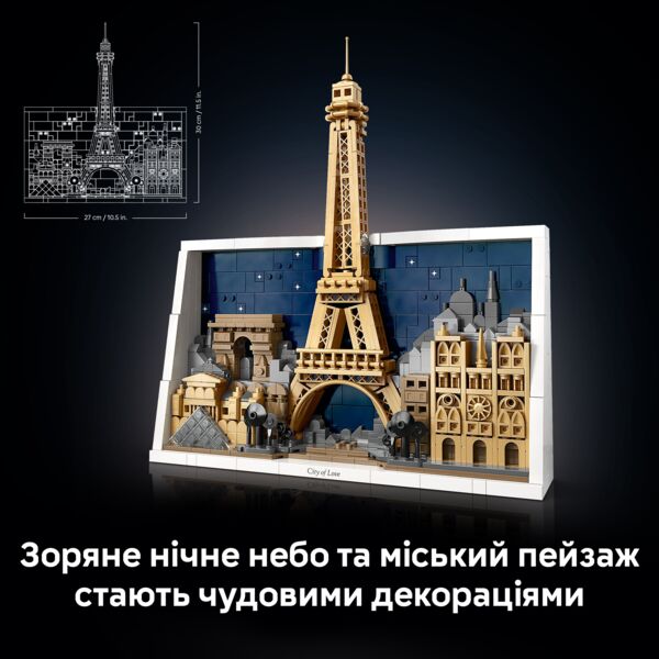 Досліджуйте зоряне небо та міський пейзаж під час складання. Відкрийте для себе деталі Ейфелевої вежі, собору Паризької Богоматері, Тріумфальної арки та Лувру. Доповніть набір цеглиною "Місто кохання" та цегляною рамою, а потім повісьте його на стіну або виставте на полицю у вашому домі чи офісі.