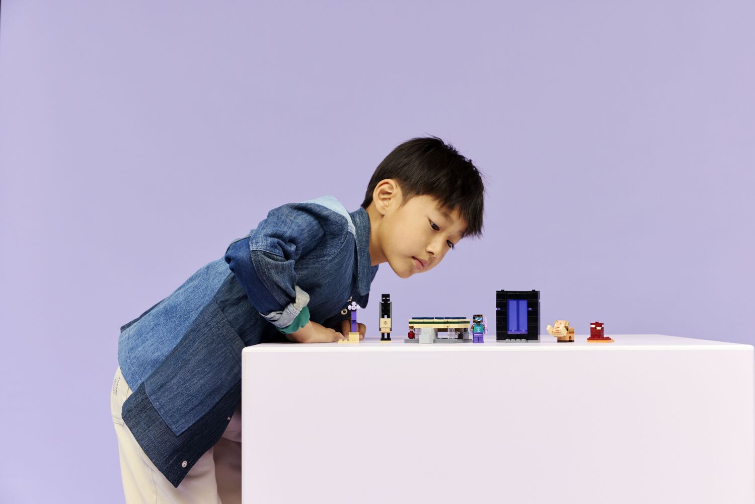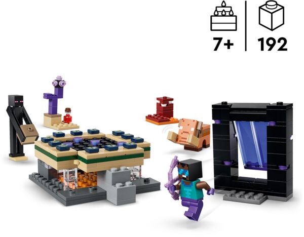 Цей ігровий набір LEGO Minecraft містить портал до Краю та до Нижнього світу з доступом до невеликих споруд для кожного біому. Автентичні аксесуари, зокрема чарівний лук та лікувальне зілля, надихають на нескінченні творчі пригоди зі знайомими сценами та персонажами Minecraft.