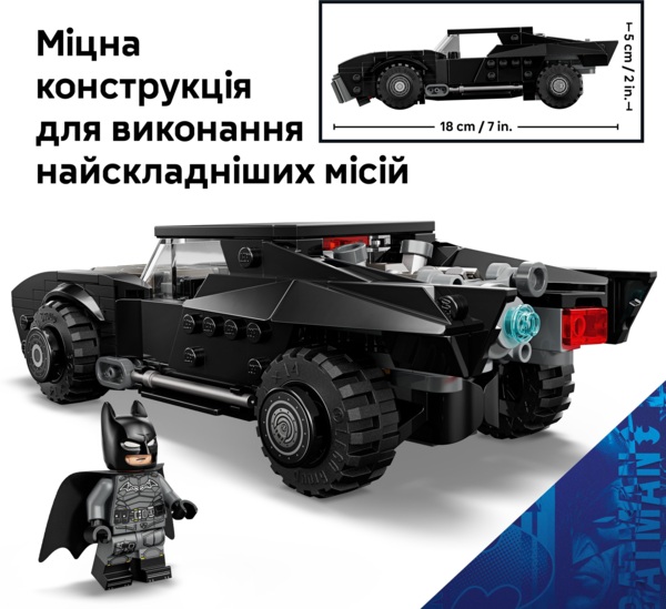 Шанувальники Бетмена можуть відтворити події фільму 2022 року за допомогою LEGO "Бетмобіль Бетмена" — набору для конструювання моделі автомобіля, призначеного для хлопчиків та дівчаток віком від 9 років. Відсвяткуйте 20-ту річницю серії LEGO DC Batman із цим колекційним набором, що містить культове авто та мініфігурку Бетмена в тканинному плащі.