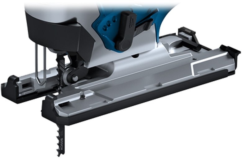 Опорну плиту можна регулювати на кут до 45° для виконання прорізів з нахилом. Інструмент поставляється зі знімним пластиковим башмаком для захисту чутливих заготовок. Його 4-ступенева орбітальна дія дозволяє вибирати між швидким або чистим різанням.